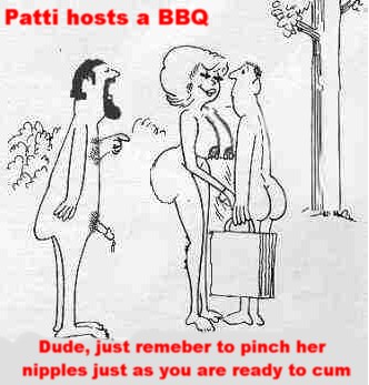 Jon spoke up, a little hoarseness in his voice he said, “Stand up Patti, I wanna see you”. Patti did as requested. Jon immediately grabbed for her left tit, stroking it through her satin bra. I reached behind and undid the hooks. Patti then pulled her bra off and her massive tits fell free. Jon was truly enjoying himself, I believe because of the entire situation as but also because his wife does not have the same massive rack my lovely Patti does. Patti finally spoke. “Come on boys, you each get one to suck” as she lifted one heavy breast in each hand. Jon and I both smiled and immediately bent over and began sucking her nipples as she presented them to us. I went for her crotch with my right hand but found out that Jon had beat me to it. He had his left hand in her panties and it felt as if he already had one of his thick stubby fingers working in and out of her sweet pussy. I stopped sucking her nipple and knelt to pull her panties down. Once out of them, she spread her thighs some so Jon could really work his finger in and out of her.