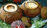Then add to soup, add salt,the milk of the coconut, bring the soup to the boil, thicken, pour into the coconut.