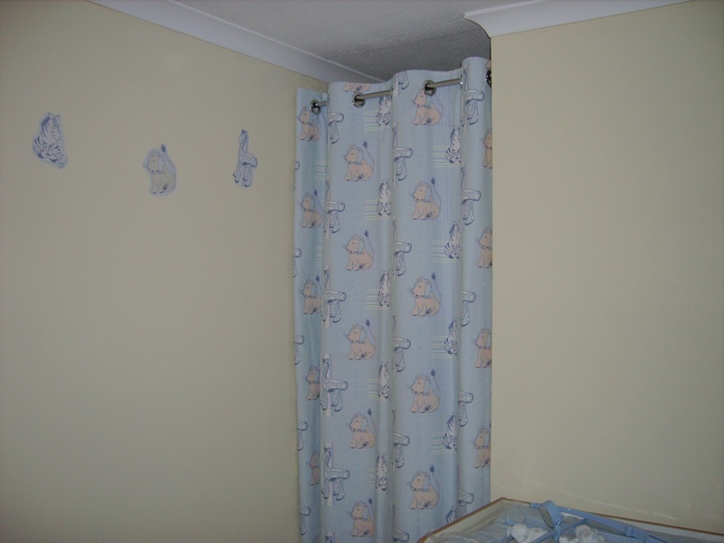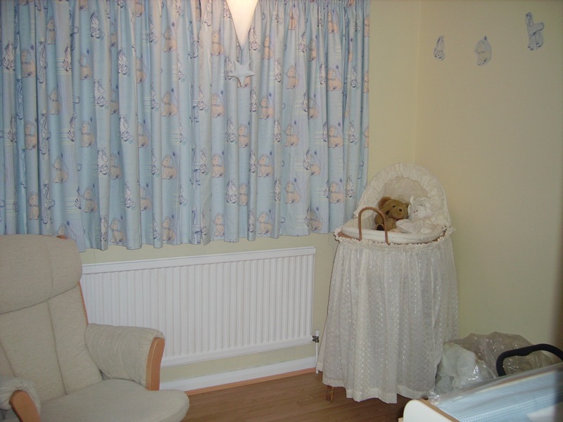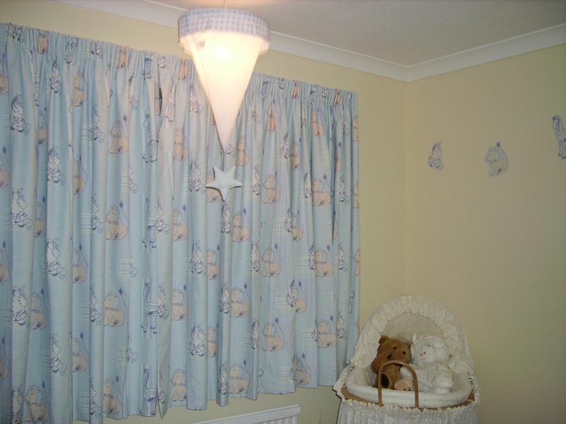 My Mum made the curtains and all the frills etc for the Moses basket and we fashioned the matching wall stickers by photocopying sections of the curtain fabric onto self adhesive paper - clever eh?!