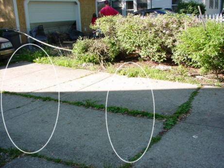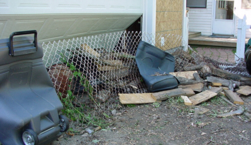 She wanted a better look and moved the fence, a chord of fire wood and the garbage cans out of the way. She must have needed to peek in the garage, so she removed the bottom two door panels and removed the air lines of a compressor sitting on the other side. You can see my daughters back door is about 20 ft. (7m) away.