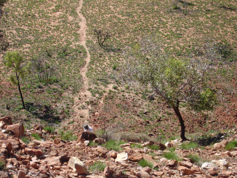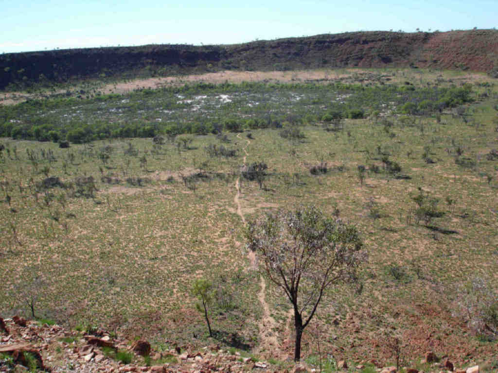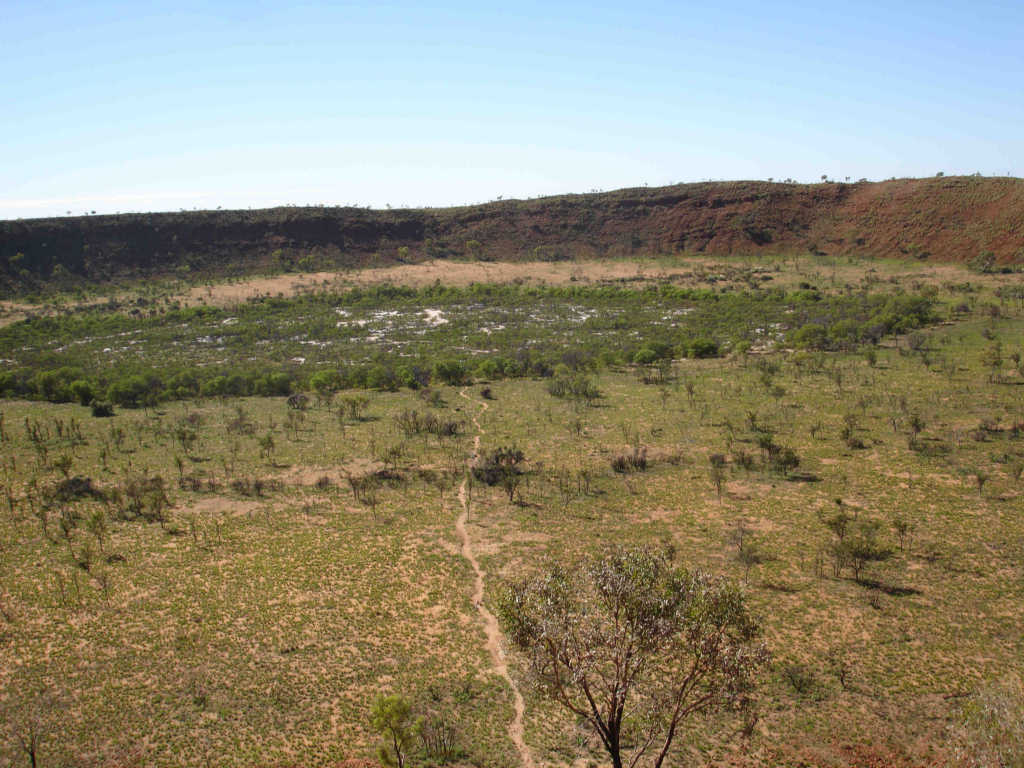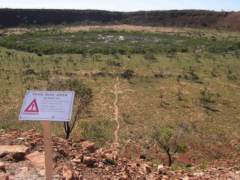 The crater was about 20km off the highway on a rough-graded road that was mostly better than the main road. The only really tough part was crossing Wolf Creek's dry bed, littered with football and canteloupe sized rocks. No way was a 2 wheel drive doing that (I have an all-wheel drive).