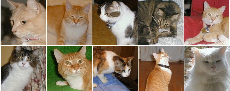 we (collectively my g/f and I)have 10 cats.... Mortimer Snerd, ShitTail Lothario, Arliss, Aubie, Ghostie, Izanagi (retired show siamese), Gillman, Zinj, Masq,Little Kitty Pizmo.
