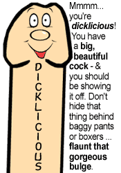 "Mmmm... you're dicklicious! You have a big, beautiful cock - & you should be showing it off. Don't hide behind baggy pants or boxers... flaunt that gorgeous bulge."