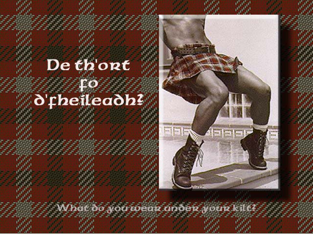 Eliza, I can tell you from experience that there is not a single blessed stich of clothing underneath that kilt. The night I made that observation will be seared into my memory forever....not to mention the nickname I still can't shake from it...."Buckle"(just imagine what the big buckles that hold those lovely kilts up do to a girls forehead)