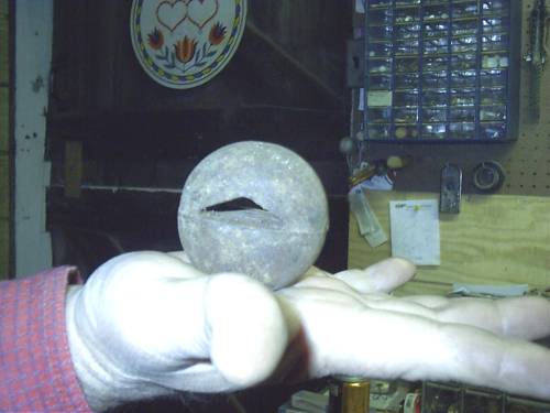 I tried my best to get as much detail of that thing as I could PF! Yes..the hole goes all the way through.....yes it does have a cast line. I likened it to the same way they make dipsey's (weights) for fishing........one side of mold filled with molten metal...then the other...and close it and let cool...and voila.....a whole weight! Didn't scratch it yet......haven't tried to clean it either. It's rusty and has a pitted surface though. I used to live near the Red Bank Battle Field in National Park, N.J........and they had an exibit of cannon balls and the house left standing from the battle of Hessian Run still had some balls in the side.....and they looked very similar to this thing....though they didn't have holes and they weren't as small.