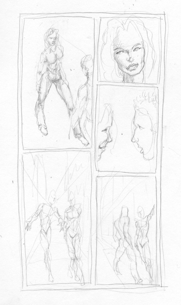 Anyway, this is a little different, I'm teaching myself the art of sequential storytelling and I thought I'd give this a shot. The old Marvel method was for the artist to draw some pages, and the writer would go in afterwords and and create astory and dialogue around it, and I thought this might be and interesting way to start. I have a couple of stories floating around in my head, but I did this thumbnail page just off the top of my head, it's just one page, boy-meets-girl thing, and I thought I'd see if anybody could write some dialogue and create a plot.